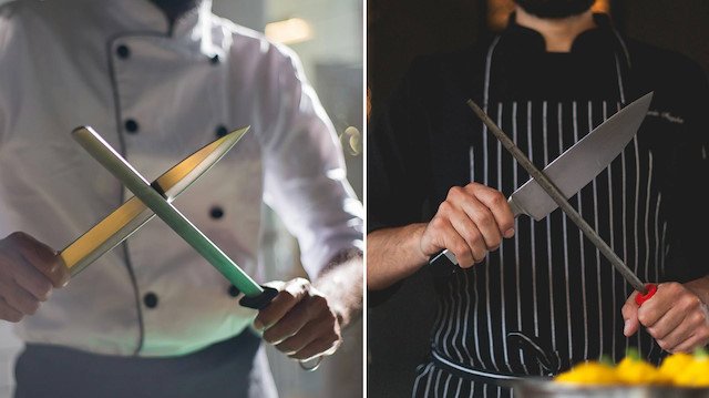 Evde bıçak bilemek için en pratik yöntemlerden biri. Bıçağı masata 20 derece açıyla yaslayarak her iki yüzünü eşit şekilde sürtmeniz gerekiyor. Bu işlem sayesinde bıçağın ağzı düzeltir, ucu körelmişse eski formuna gelir.